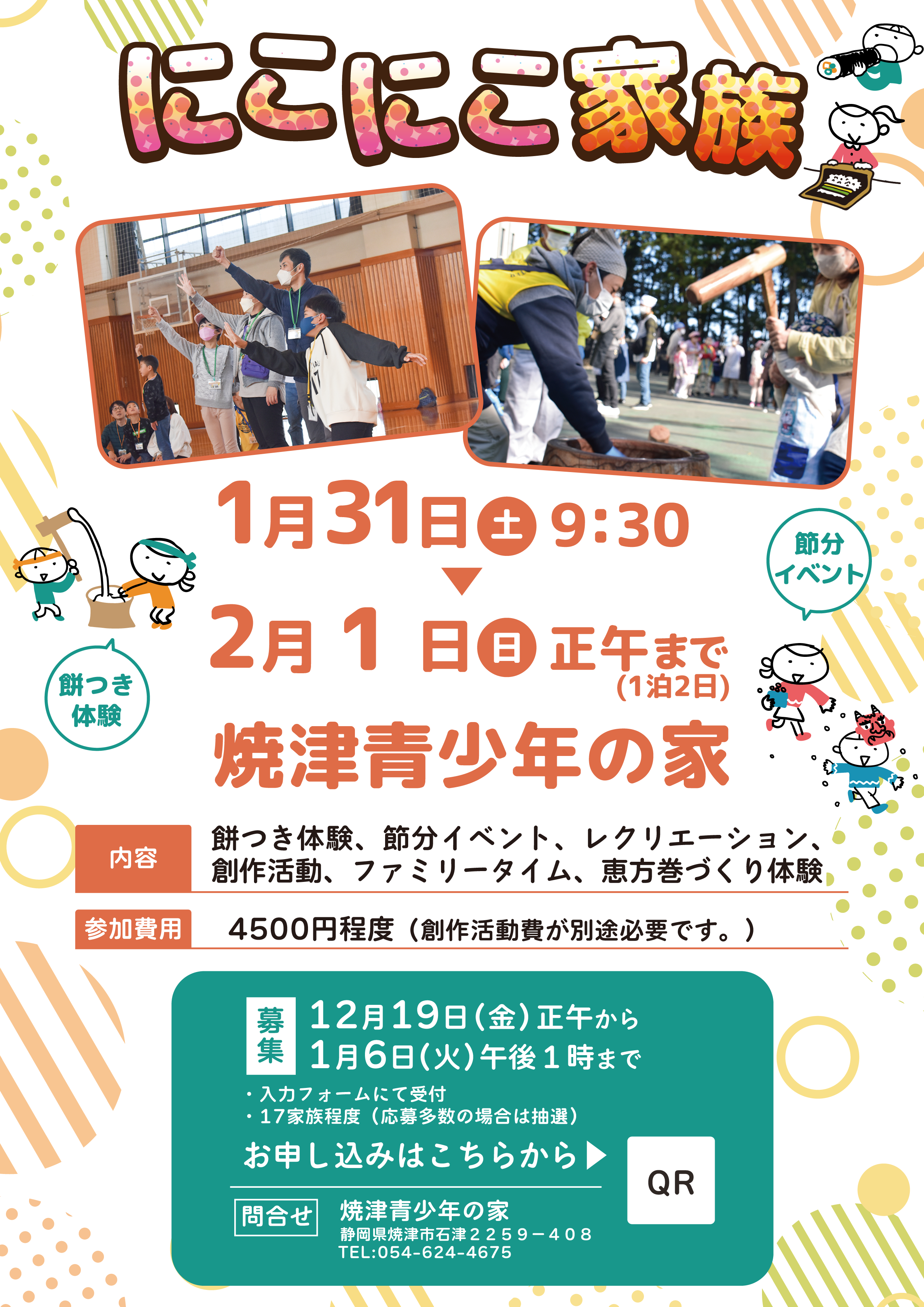 家族と一緒に餅つきや節分、レクリエーションなどをして、にこにこな思い出を作ってみませんか?日本文化に触れた思い出をぜひ!!